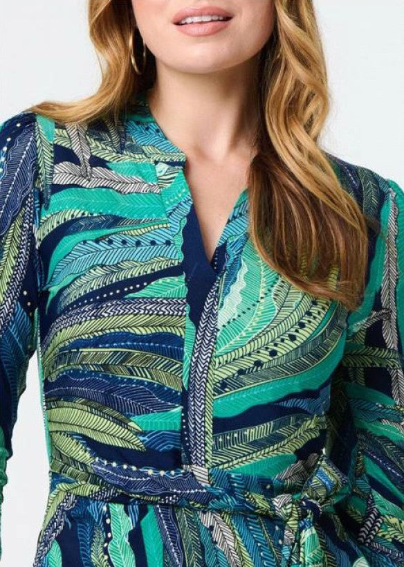 The Liza Dress showcases a vibrant tropical leaf pattern that brings a fresh, elegant touch to your wardrobe. Designed with knee-length coverage and long sleeves, it offers a balanced blend of style and comfort suitable for various occasions. This dress exemplifies expert tailoring with its flattering fit and timeless appeal.