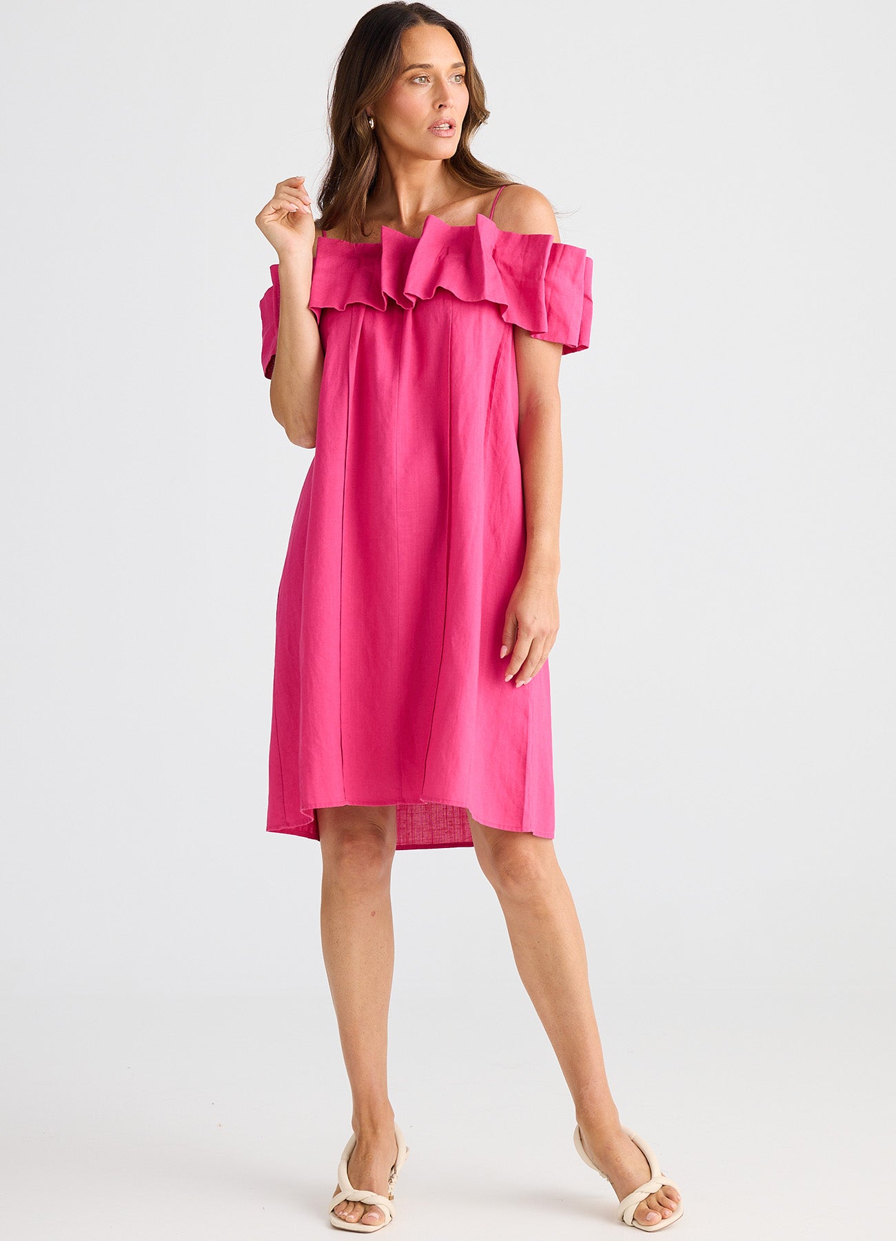 This chic Osaka dress offers an effortlessly feminine silhouette with a playful flair. Designed with a ruffled neckline that beautifully frames the shoulders, it also features thin adjustable straps for added support and comfort. The relaxed, knee-length fit drapes softly over the body, creating a breezy and flattering look. Perfect for warm days or casual outings, this dress blends comfort and style with ease.