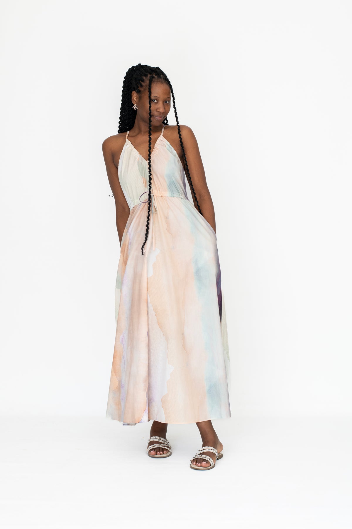 The Val Dress features a stylish halterneck design that highlights the shoulders while offering a flattering silhouette. A waist tie allows for adjustable shaping to enhance your figure, and practical pockets add convenience without compromising elegance. This dress combines functional details with expert craftsmanship for a polished, versatile look.