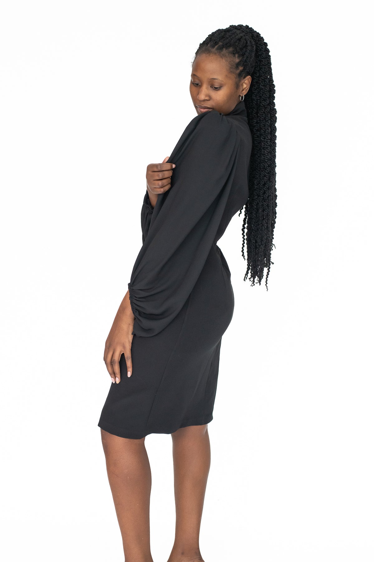 Sophisticated, sleek, and effortlessly polished—this black dress is the ultimate modern classic. It features a structured silhouette with a refined mock neck and statement puffed long sleeves that gather gently at the cuffs for soft volume. The dress skims the body with a straight-cut knee-length hem, offering a flattering and elegant fit.