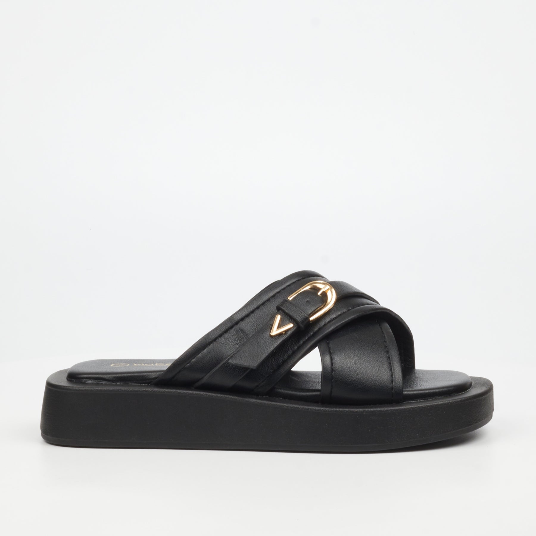 Chic and versatile, this slip-on shoe is designed with a sleek square toe for a modern edge. The crossover straps create a stylish silhouette, complemented by a metallic buckle detail that adds a touch of polish. Easy to wear yet effortlessly elegant, it’s a perfect choice for both casual and smart-casual looks.