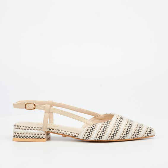 This pointed-toe flat exudes timeless sophistication with a modern twist. Designed with a slingback strap for a secure and comfortable fit, it features a tweed-inspired texture that adds a refined, classic touch. The sleek pointed silhouette enhances the leg line, making it perfect for both workwear and polished casual looks.