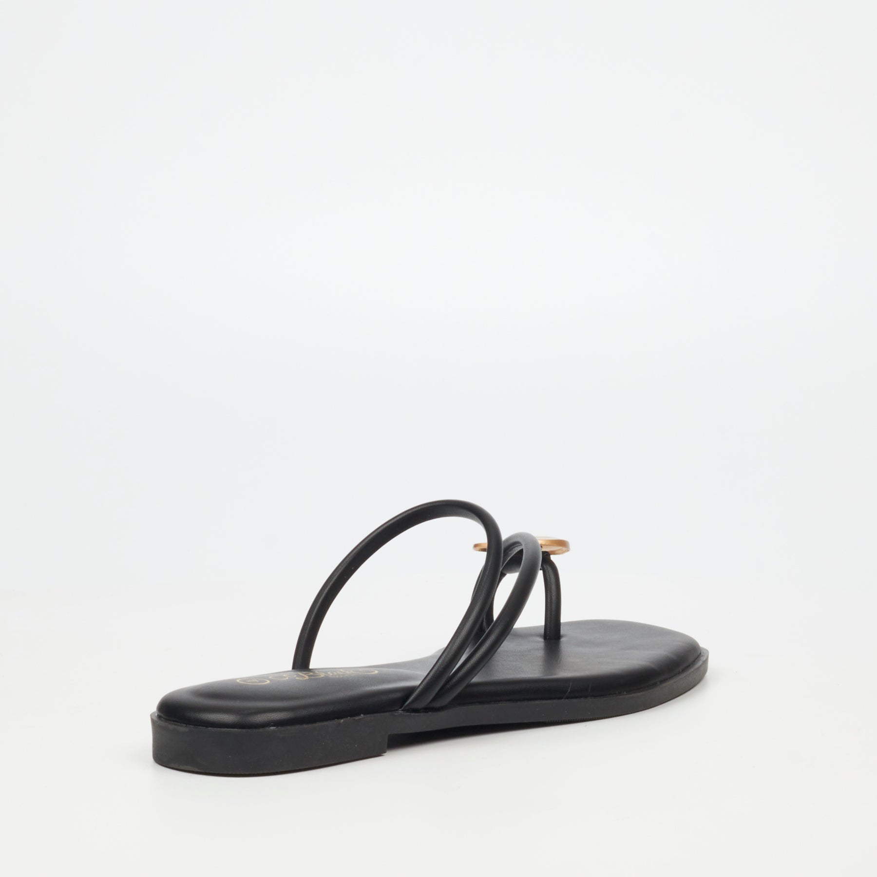 Minimalist and modern, this black flat sandal is designed with sleek double straps and a unique toe loop detail, finished with a small gold-tone accent for a touch of elegance. Its streamlined silhouette and flat sole make it a versatile choice for both casual and dressier looks.