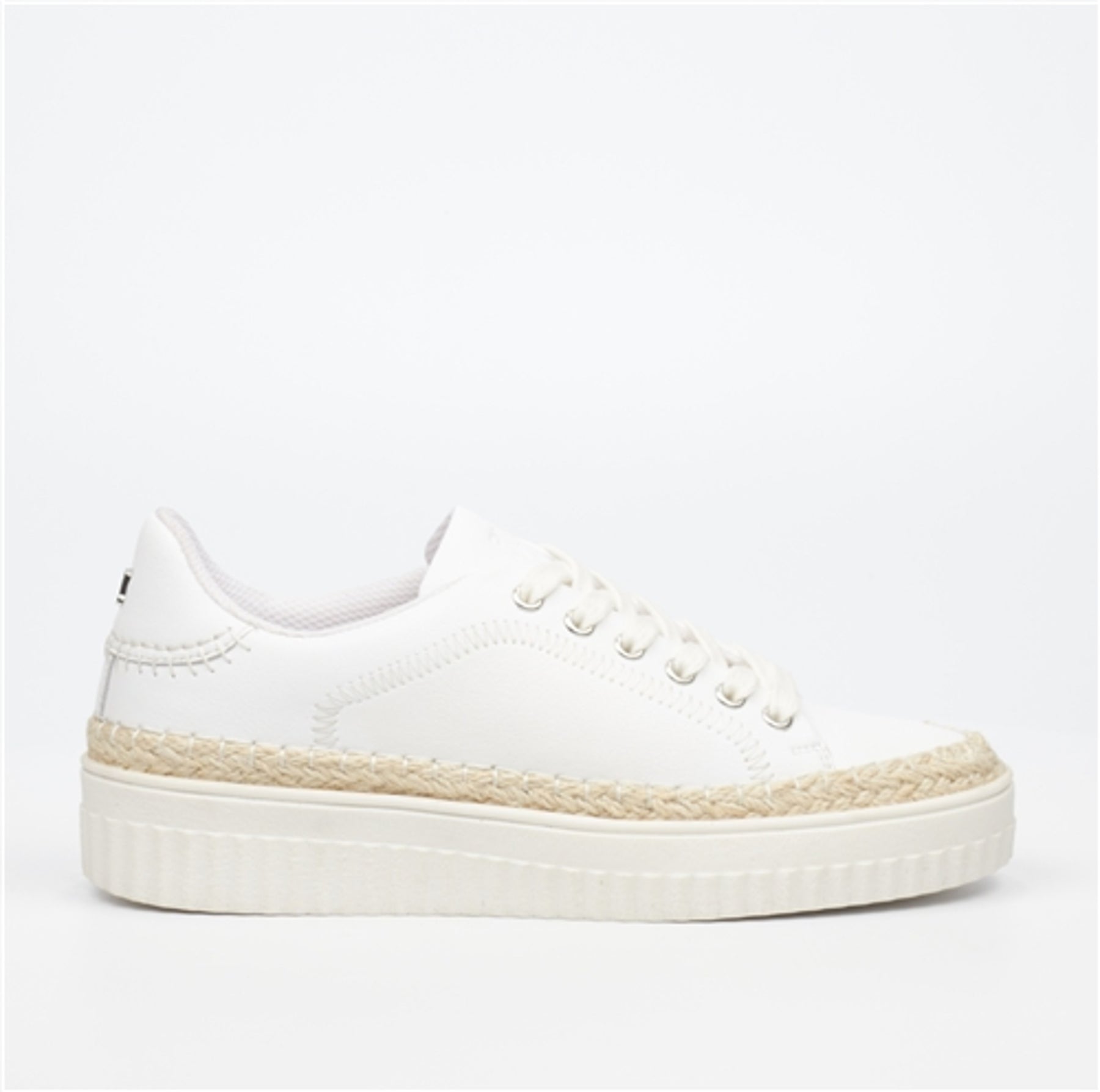 The silhouette is clean and minimal, featuring smooth leather uppers in a crisp, natural finish. A slightly rounded toe, waxed laces, and subtle stitching lend it a polished, refined edge. The defining element—a chunky, sculpted rubber sole—adds both height and a contemporary twist, without compromising on support or walkability.