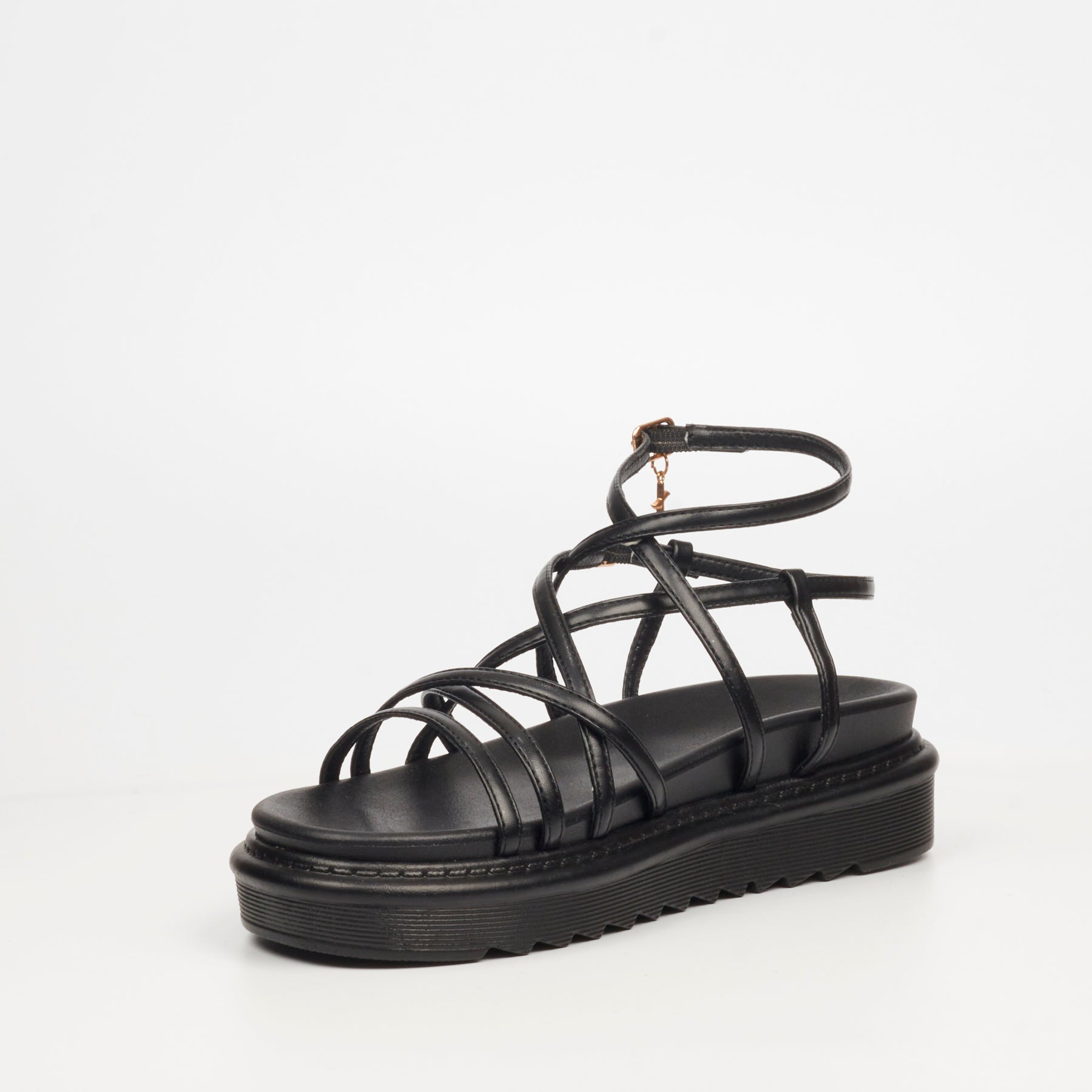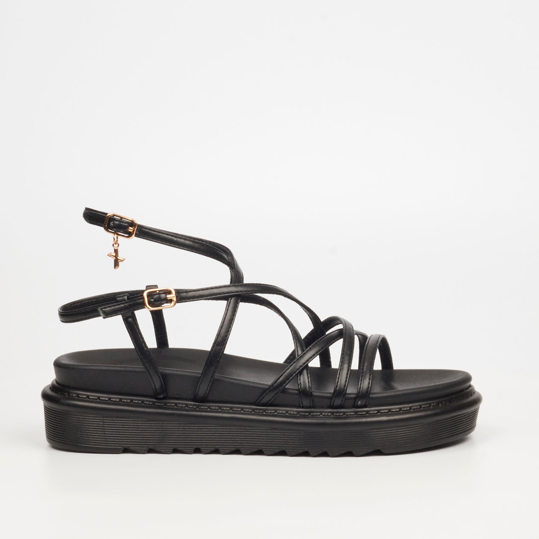 Minimalist and modern, this black flat sandal is designed with sleek double straps and a unique toe loop detail, finished with a small gold-tone accent for a touch of elegance. Its streamlined silhouette and flat sole make it a versatile choice for both casual and dressier looks.