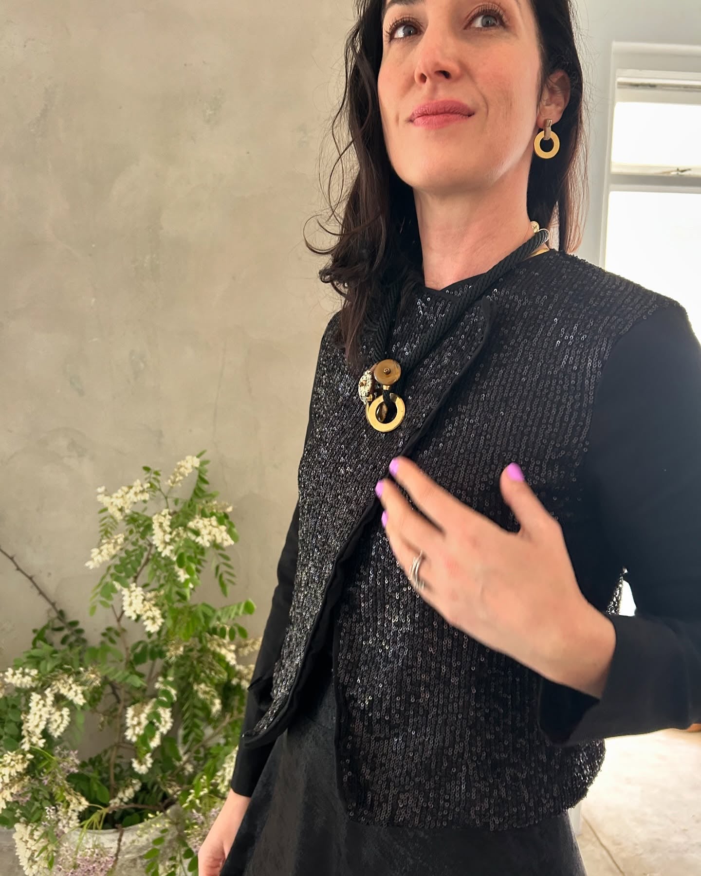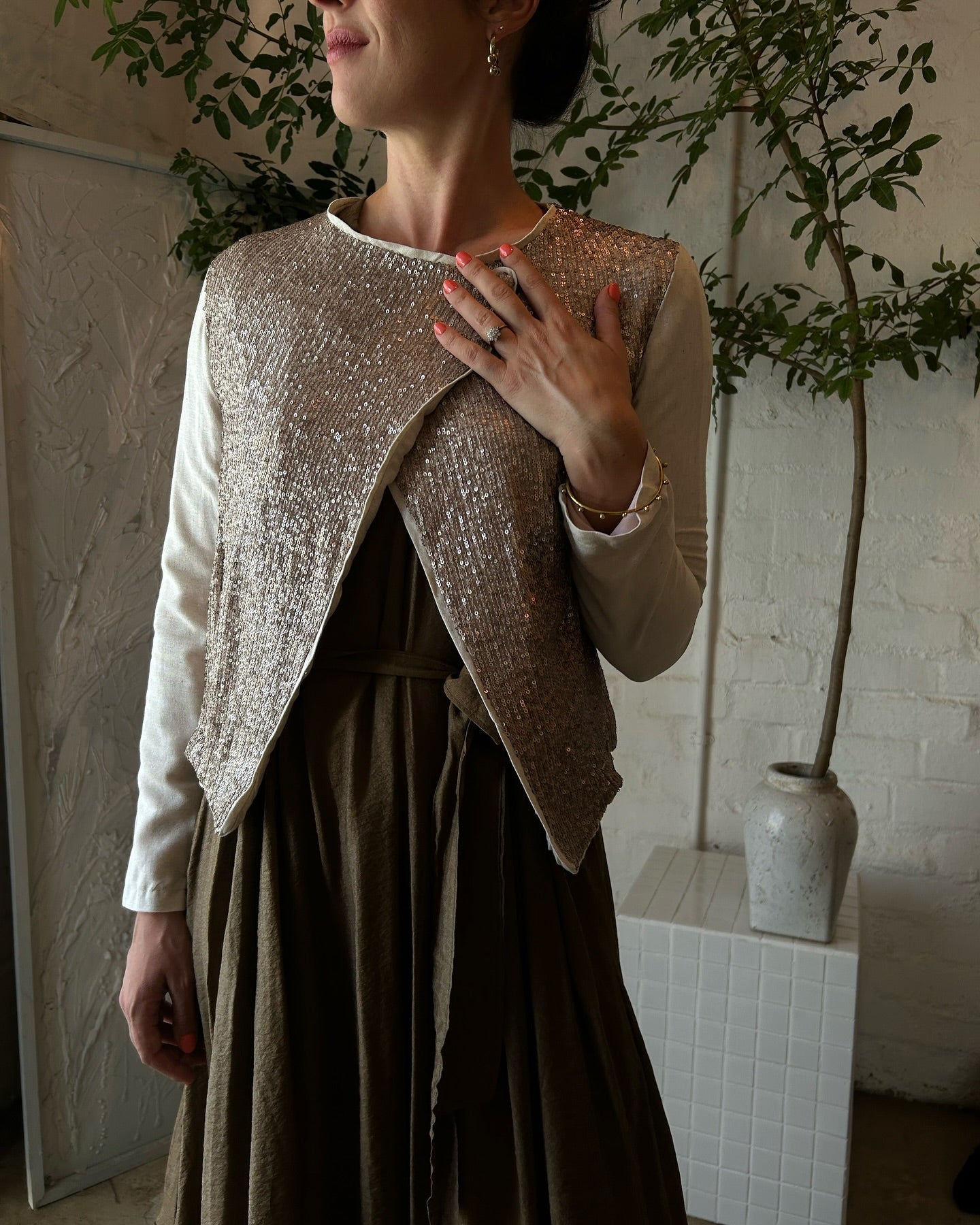 Let the sequin waterfall jacket be the statement piece—pair it with a sleek monochrome outfit like a beige camisole and tailored trousers or a simple slip dress. Keep accessories minimal to let the shimmer shine without overwhelming the look.