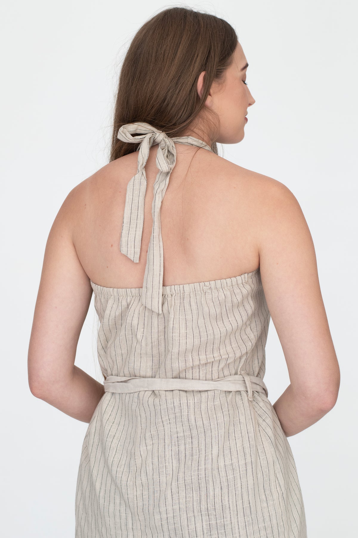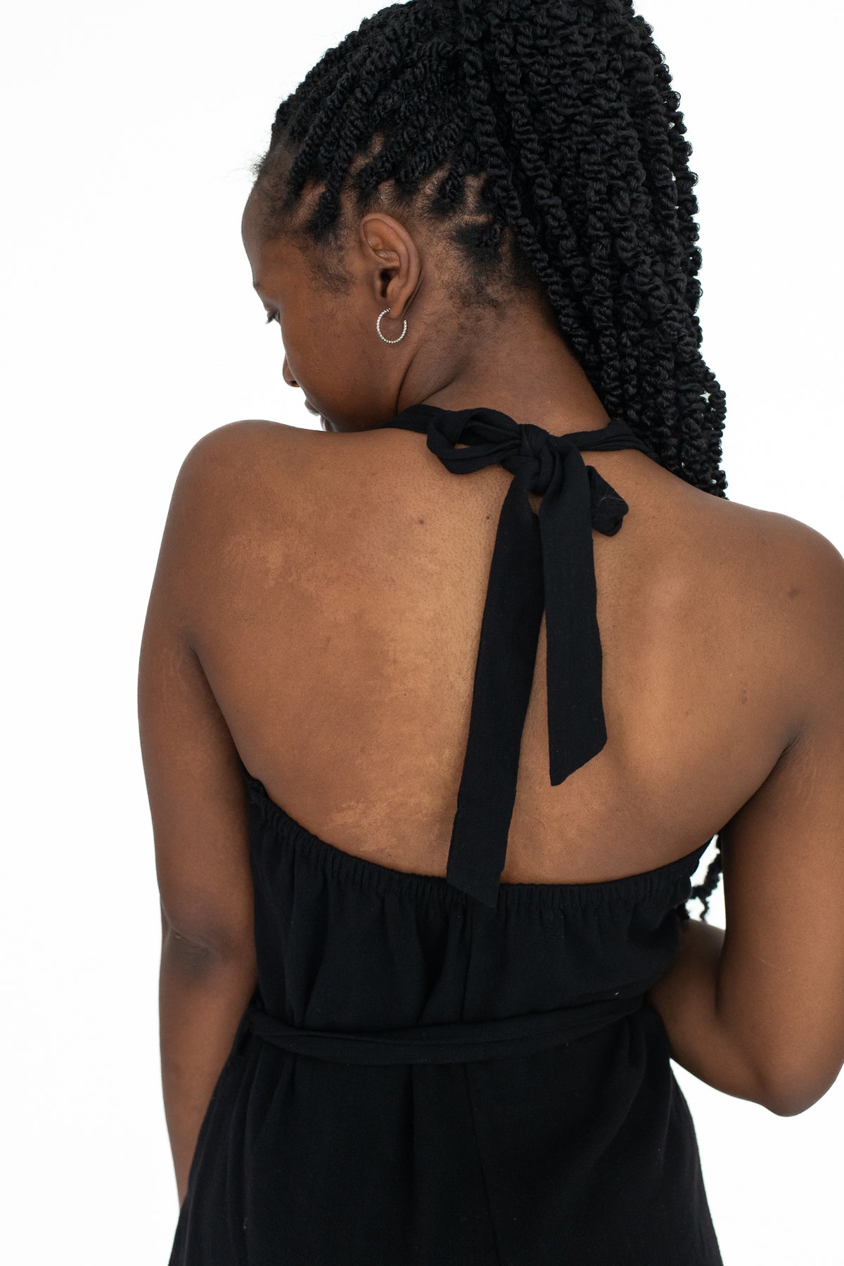 Turn heads in our backless  halter neck dress , the perfect blend of relaxed sophistication and summer-ready style. Featuring a flattering halter neck design and a front button-down closure, this dress offers an elegant silhouette with a hint of vintage charm.