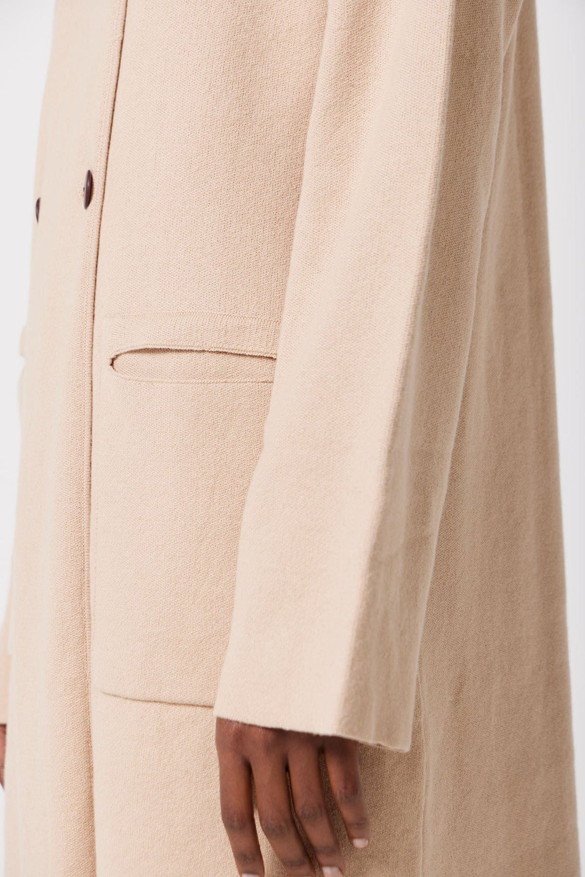 Effortlessly elegant with a modern twist, this hooded coat is a refined outerwear staple for cooler seasons. Crafted from a soft wool-blend fabric, it features a relaxed, slightly oversized fit that drapes beautifully over layers. The coat is detailed with a sophisticated double-breasted button front in contrasting dark tones, adding a tailored edge to its otherwise casual silhouette.