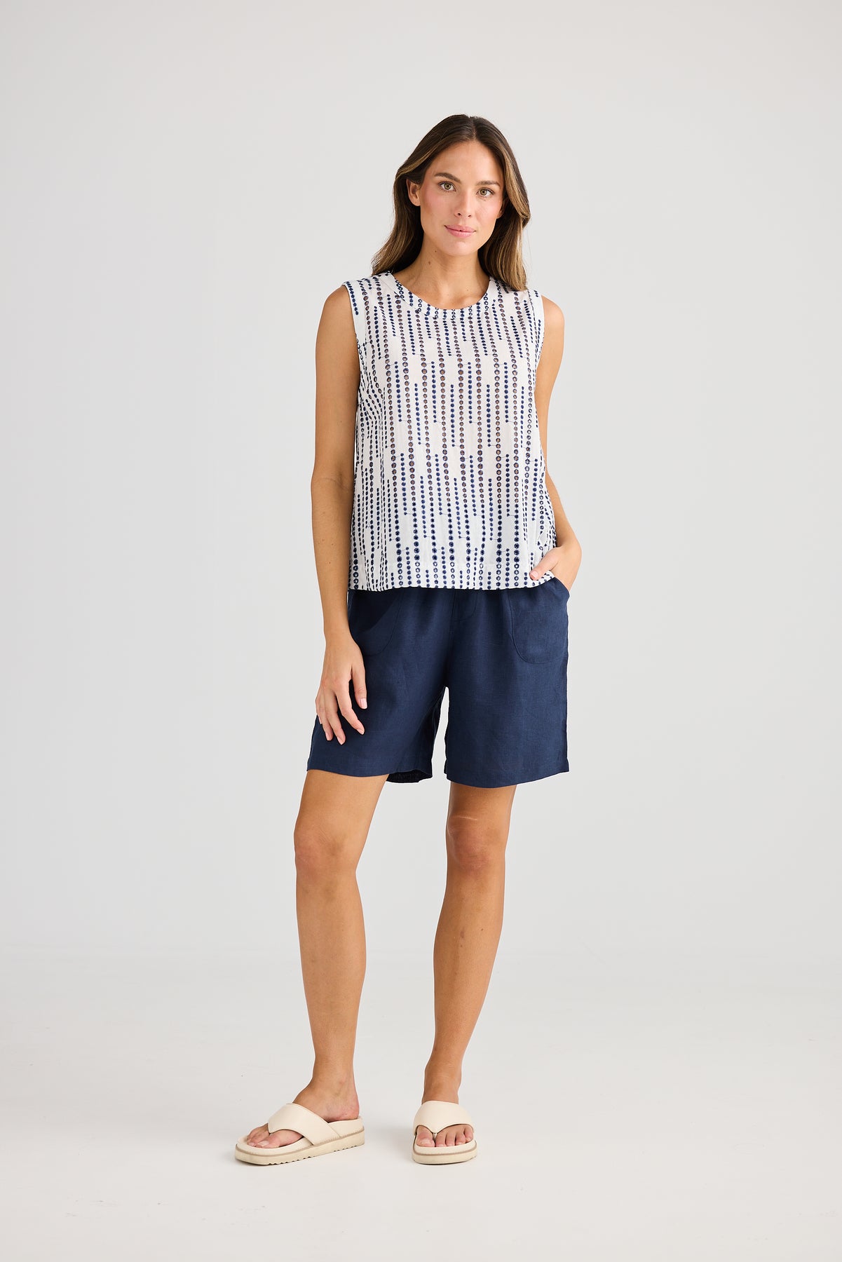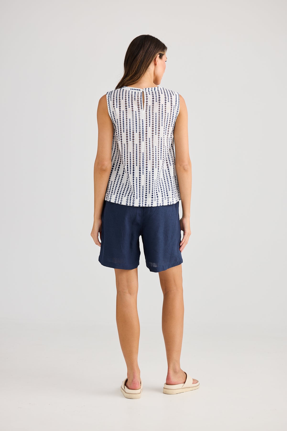 This crisp white sleeveless top features a classic round neckline for a clean and versatile look. Adorned with delicate blue circle embroidery details across the front, it adds a subtle yet striking touch of artistry. The lightweight fabric ensures comfort and breathability, making it perfect for warm weather or layering under jackets and cardigans.